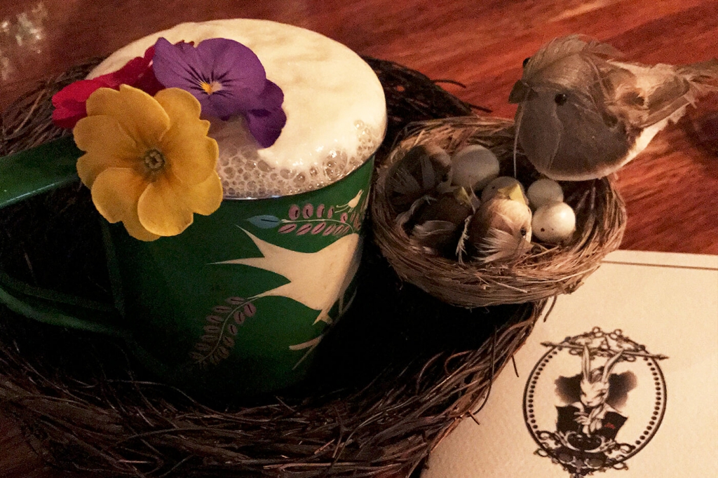 它是如何調(diào)制的?酒單上的配方里寫到了羅勒葉浸漬的必富達金酒、菠蘿蜂蜜和IPA泡沫,不過調(diào)酒師告訴我里面還用到了檸檬汁。Alice酒吧的雞尾酒出名的地方在它的裝飾,這杯也不例外。可食用花(靈感來自 Marian Beke掌舵Nightjar期間的創(chuàng)意 ),還有裝在“鳥巢”里的巧克力蛋(有著可口糖衣的那種)完整呈現(xiàn)了Birds and Bees所要表達的主題。
